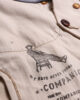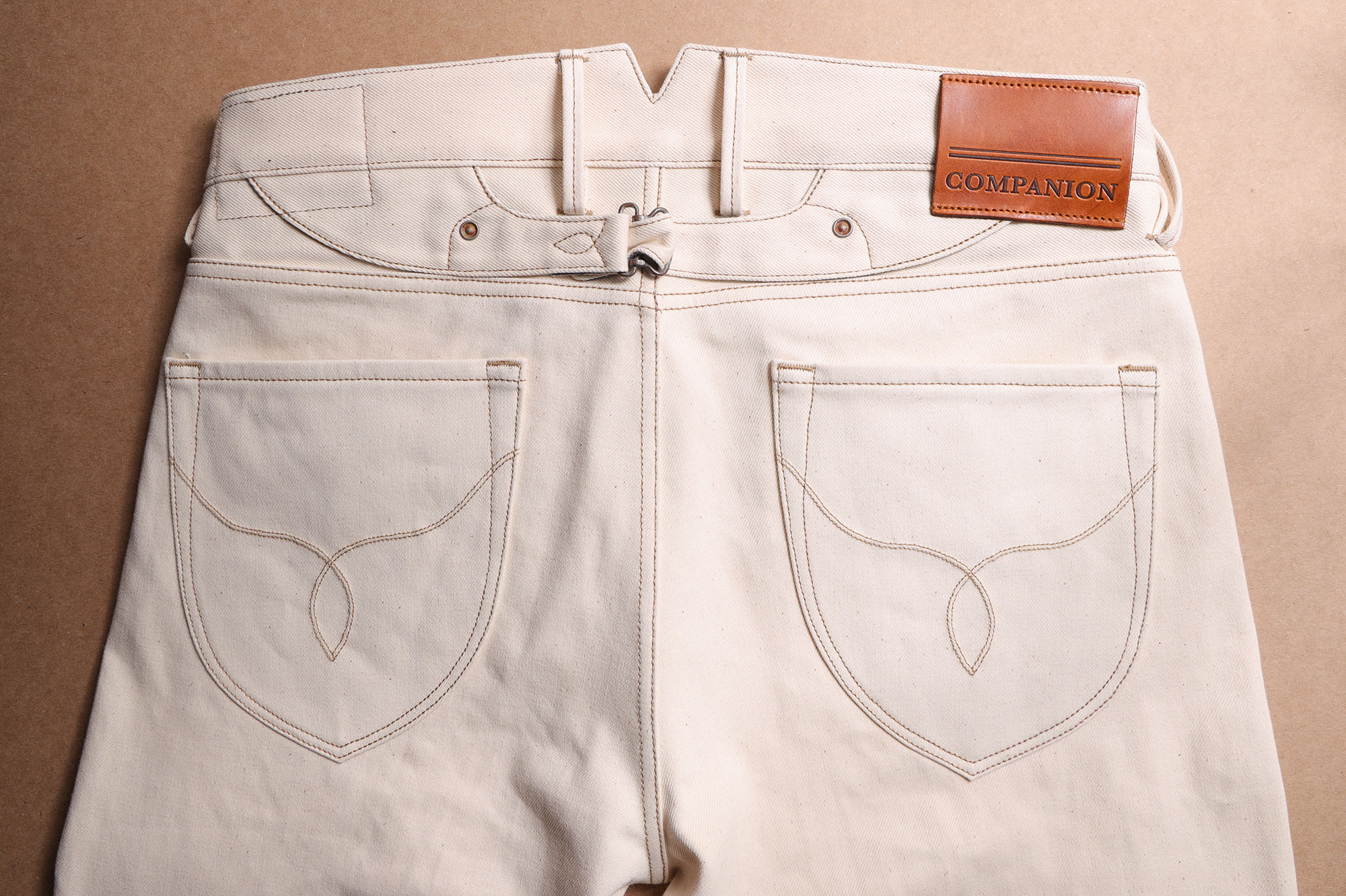 14 Oz. Ecru bull denim, selvedge, 100% cotton, sanforized, Japan.
